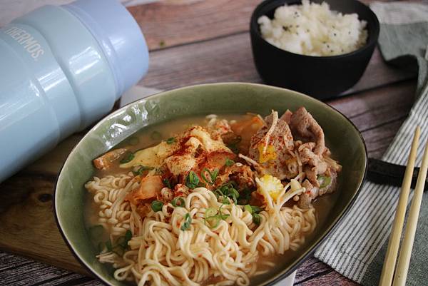 3.瀝乾後,放入玉米筍與金針菇,再注入沸水至8分滿,預熱1分鐘。4.再次瀝乾,放入火腿丁、泡菜、烹大師還有辣椒粉與雞蛋。5.注入沸水至8分滿,旋緊上蓋燜30分鐘。6.取一個大碗放入科學麵,直接開蓋將食材與湯倒入碗中。7.撒上起司片與蔥花即可享用。